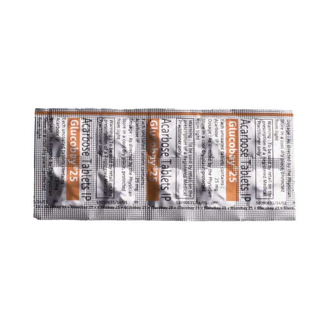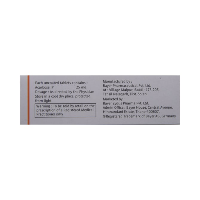 Glucobay 25 Tablet is used to treat people with type 2 diabetes mellitus. It helps lower blood sugar levels after meals. It belongs to a group of medicines known as alpha-glucosidase inhibitors. This medicine is usually prescribed in combination with other diabetes medications.