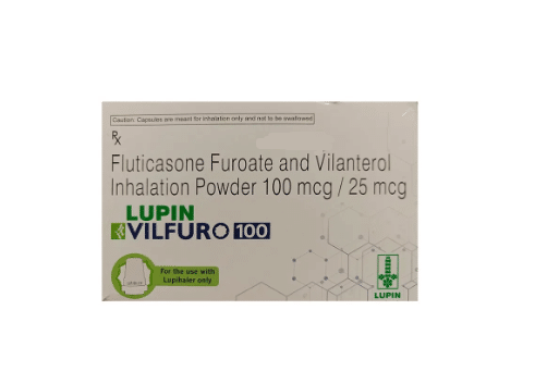 Lupin Vilfuro 100 Capsule is a combination of two medicines that opens the airways and makes it easier to breathe. It is used in the treatment of asthma (wheezing and shortness of breath) and chronic obstructive pulmonary disorder (a lung disorder in which the flow of air to the lungs is blocked).The effect of Lupin Vilfuro 100 Capsule may be noticeable after a few days but will only reach its maximum after a few weeks. This medicine must be used regularly for it to show its effect, so take it even if you don’t have any symptoms. If you stop taking it before the prescribed duration, your asthma and chronic obstructive pulmonary disorder (COPD) may worsen. It should not be used to relieve sudden asthma attacks. If an asthma attack occurs, use your quick-relief inhaler (reliever). To get the most benefits from this medicine, make sure you get your inhaler technique right; otherwise, the medicine wont work well.The most common side effects of Lupin Vilfuro 100 Capsule are nasopharyngitis, upper respiratory tract infection, headache, fever, back pain, pneumonia, sinusitis, and cough. You can prevent some of these symptoms by rinsing your mouth and throat with water or brushing your teeth after using your inhaler. There are other, rarer side effects that can be serious. Talk to your doctor if you’re worried about them. In general, try to avoid situations which make your asthma worse (your triggers), and do not smoke.Ask your doctor whether its safe to take this medicine if you’re pregnant or breastfeeding. Before taking it, tell your doctor if you have any kidney or liver diseases so that they can prescribe a suitable dose for you.