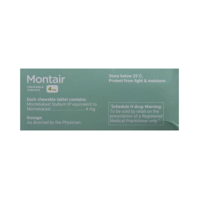 Montair Chewable Tablet is a leukotriene antagonist that works by blocking a chemical messenger (leukotriene). This reduces inflammation (swelling) in the airways and nose and improves symptoms.
