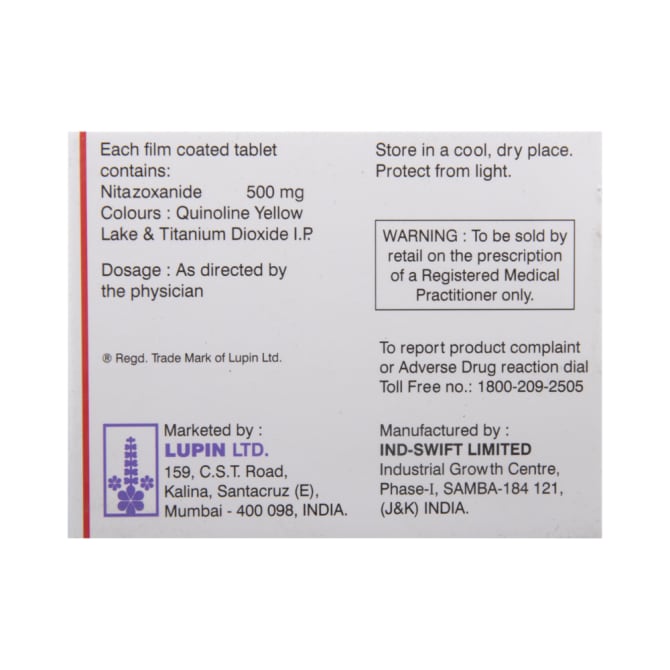 Nitazoxanide 500 Tablet is an antiparasitic medication, used in the treatment of diarrhea and worm infections. It inhibits the growth of the parasite and thus treats your infection. Nitazoxanide(Alinia) 500 Tablet should be used in the dose and duration as advised by your doctor. It should be taken with food, preferably at a fixed time. Avoid skipping any doses and finish the full course of treatment even if you feel better. Do not take a double dose to make up for a missed dose. Simply take the next dose as planned. Some people may experience headaches, nausea, fever, hair loss, and vomiting as the side effects of this medicine. Please consult your doctor if these do not resolve or persist for a longer duration. You may be monitored with blood tests and liver function tests throughout your treatment.